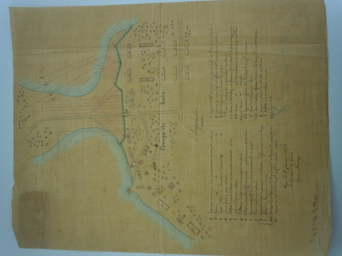 Île des Pins, Kuto, XIXᵉ siècle — Aquarelle représentant l'ensemble pénitentiaire dans son organisation spatiale. La composition révèle l'implantation des bâtiments en alignement au sein de la végétation tropicale. L'accès principal, situé sur la partie gauche de la vue, est signalé par la présence d'un grand araucaria ou pin colonnaire caractéristique. L'entrée centrale, desservie par un escalier, conduit à une place d'honneur agrémentée d'une fontaine. Au premier plan, l'infrastructure portuaire se compose d'un débarcadère qui se prolonge vers les eaux profondes par un ouvrage de trois piles maçonnées en pierre, supportant un fanal d'éclairage et une grue de déchargement en charpente de bois.